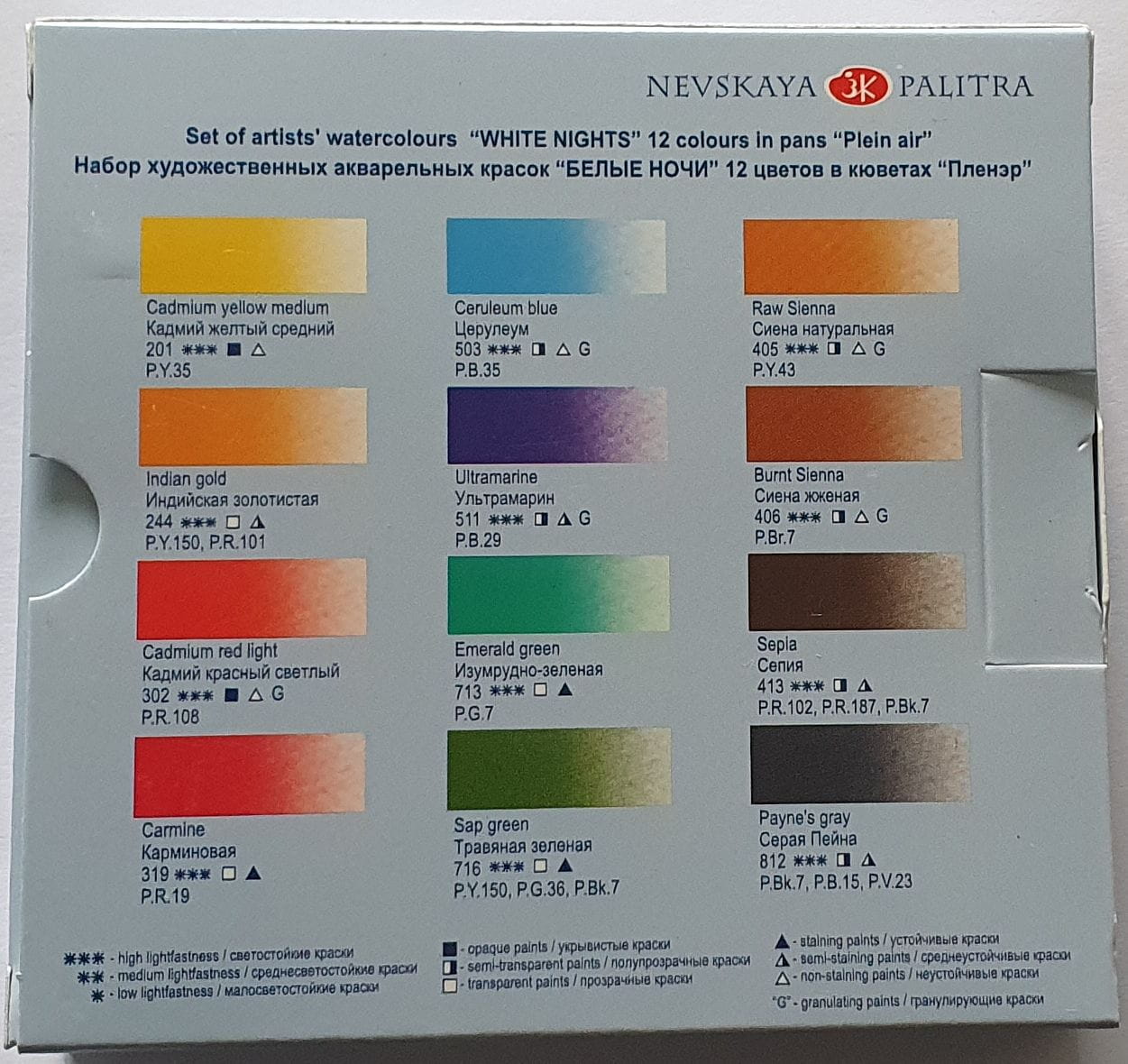 Profesjonalne farby akwarelowe w kostkach. Charakteryzują się intensywnym nasyceniem barw, które nie słabnie nawet przy zastosowaniu dużej ilości wody. Kolory doskonale łączą się ze sobą i łatwo rozmywają. Wysoka odporność na światło. Produkcja Rosja.
