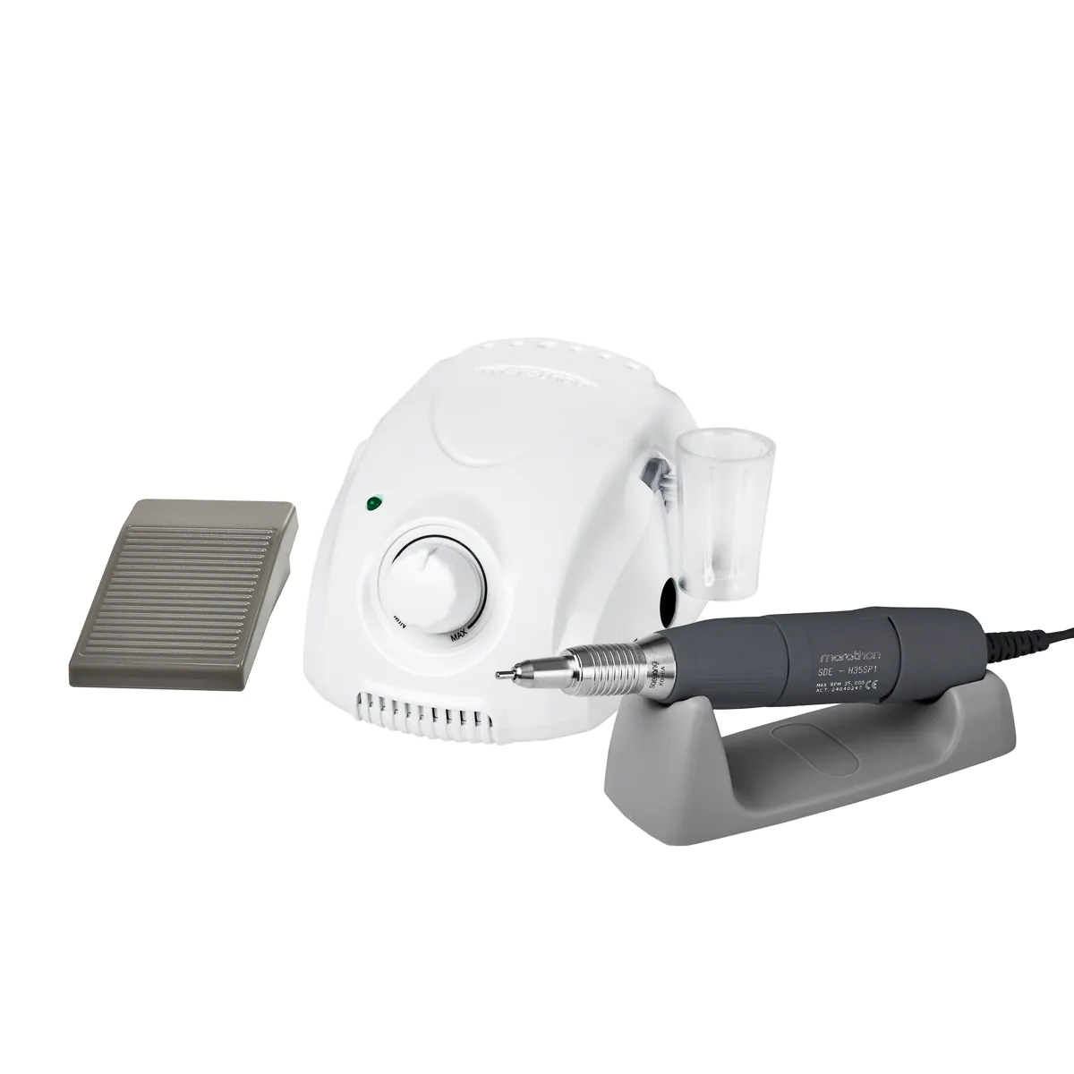 Dołączone do zestawu akcesoria zapewniają bezpieczeństwo oraz wygodę korzystania. Frezarka wyposażona jest w napęd nożny, umożliwiający precyzyjne kontrolowanie pracy głowicy i swobodną, komfortową pracę, dzięki możliwości sterowania urządzeniem bez użycia rąk. W trakcie pracy głowicę bezpiecznie można odłożyć na dołączony do zestawu dedykowany silikonowy stojak lub odwiesić dzięki wygodnemu plastikowemu uchwytowi, który można zamontować po obu stronach urządzenia. Miejsce na frezy na obudowie pozwala na przygotowanie niezbędnych narzędzi, by mieć je pod ręką w trakcie pracy.