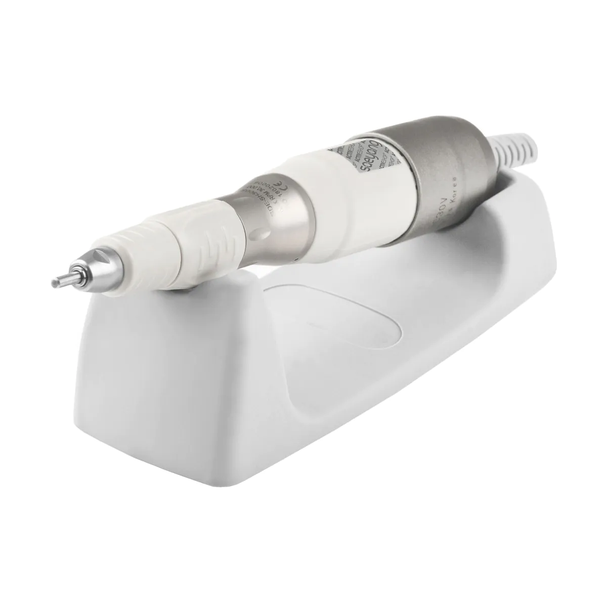 Możesz przełączać obroty na lewe lub prawe. Dioda poinformuje cię o chwilowym przeciążeniu. Możesz podłączyć napęd nożny i sterować nim prędkością (zupełnie jak pedałem gazu w samochodzie). Podczas przerwy głowicę możesz postawić na silikonowej podstawce lub włożyć do uchwytu. Trzymaj kilka frezów na stojaku w bazie frezarki i łatwo wymieniaj je podczas zabiegu.