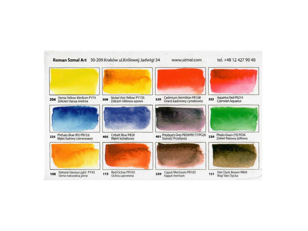 - zestaw zawiera 12 kolorów akwareli artystycznych, wybranych przez znanego, polskiego akwarelistę Artura Przybysza (członek ZPAP oraz Stowarzyszenia Akwarelistów Polskich),