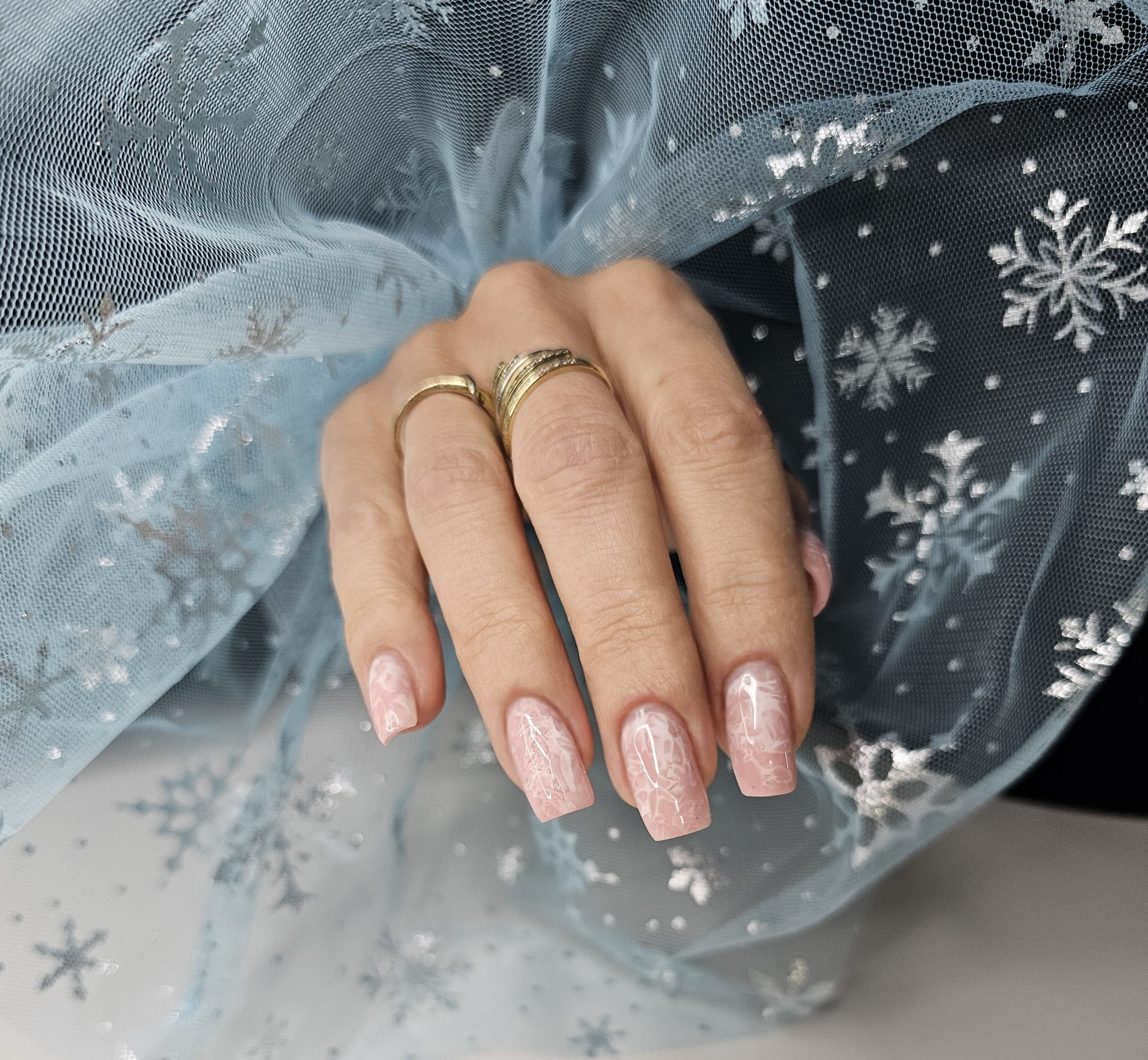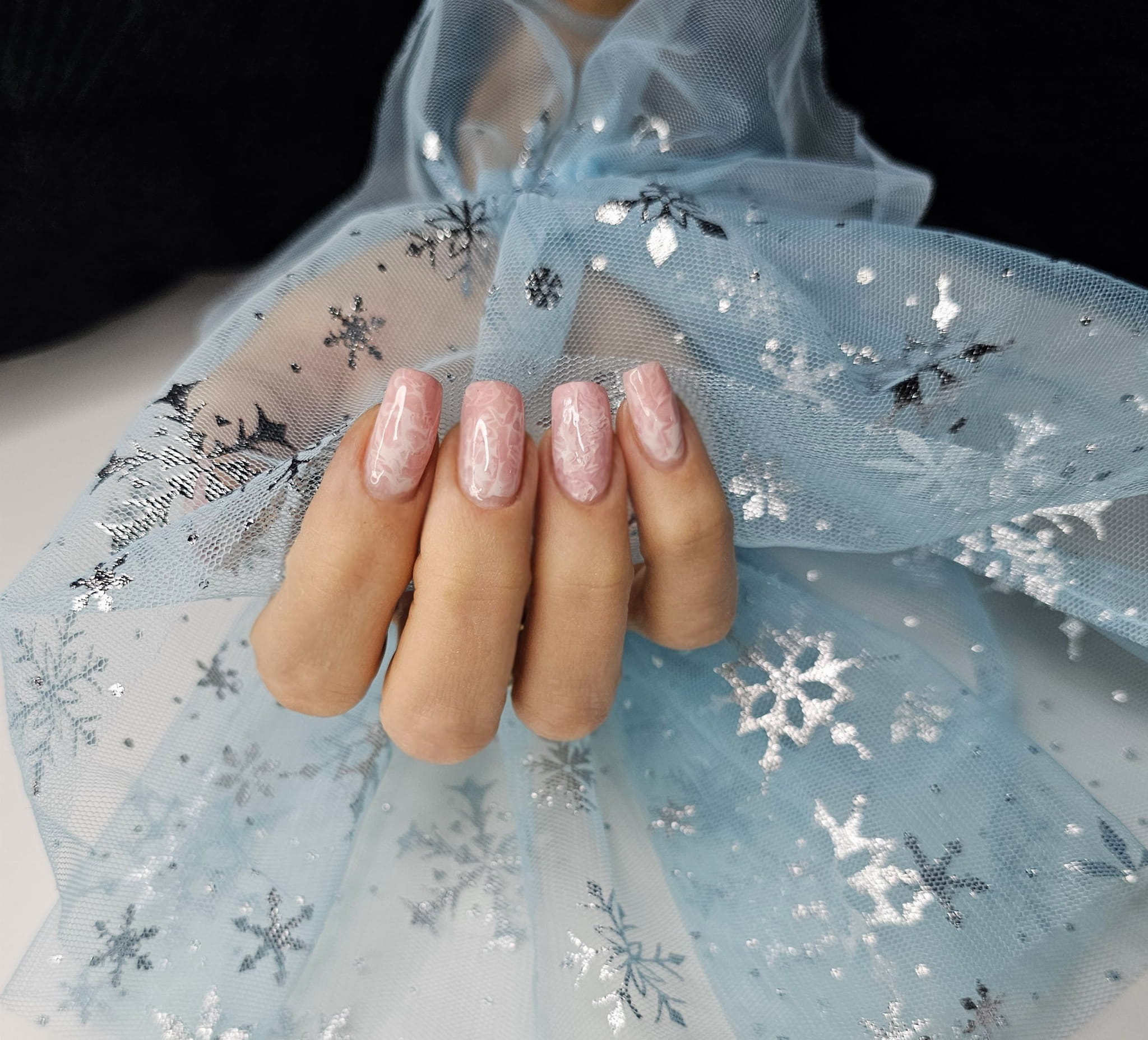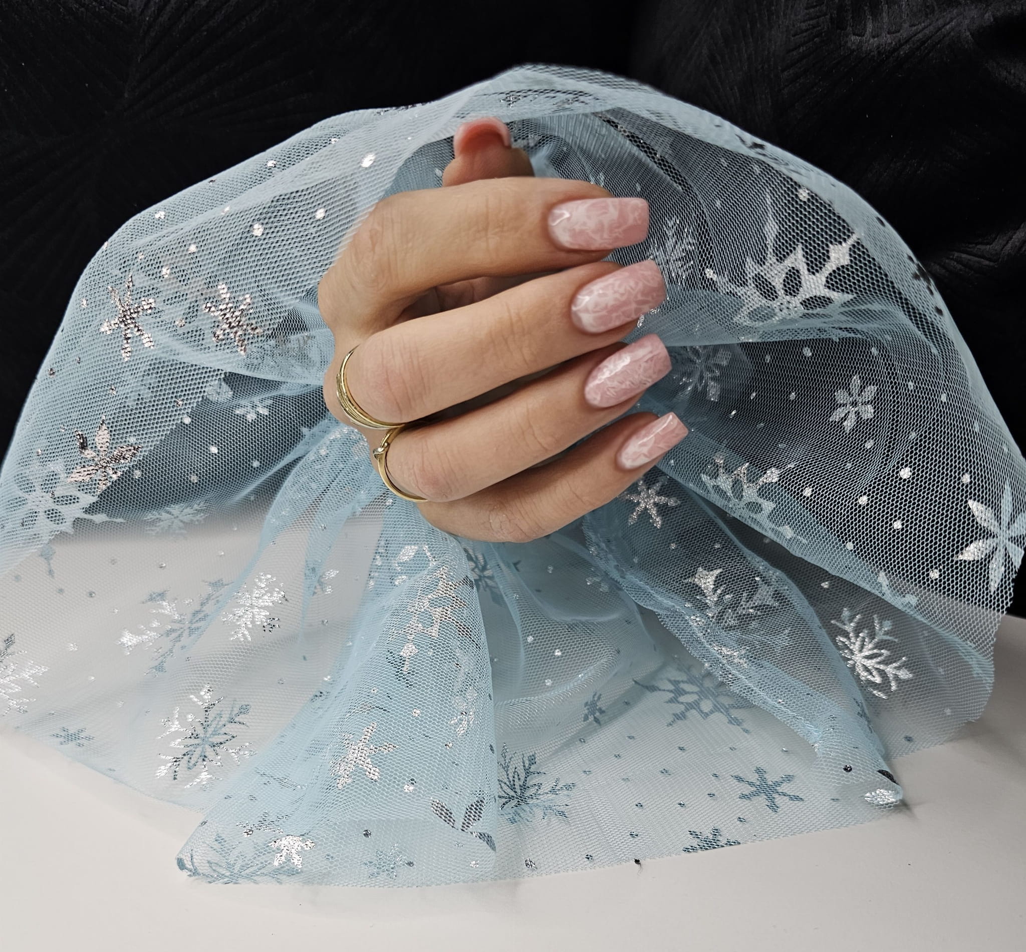Rękaw do zdjęć paznokci tiul błękitny śnieżynki srebrne