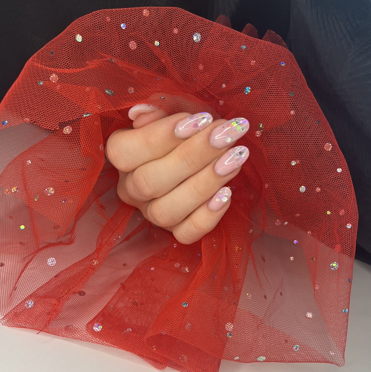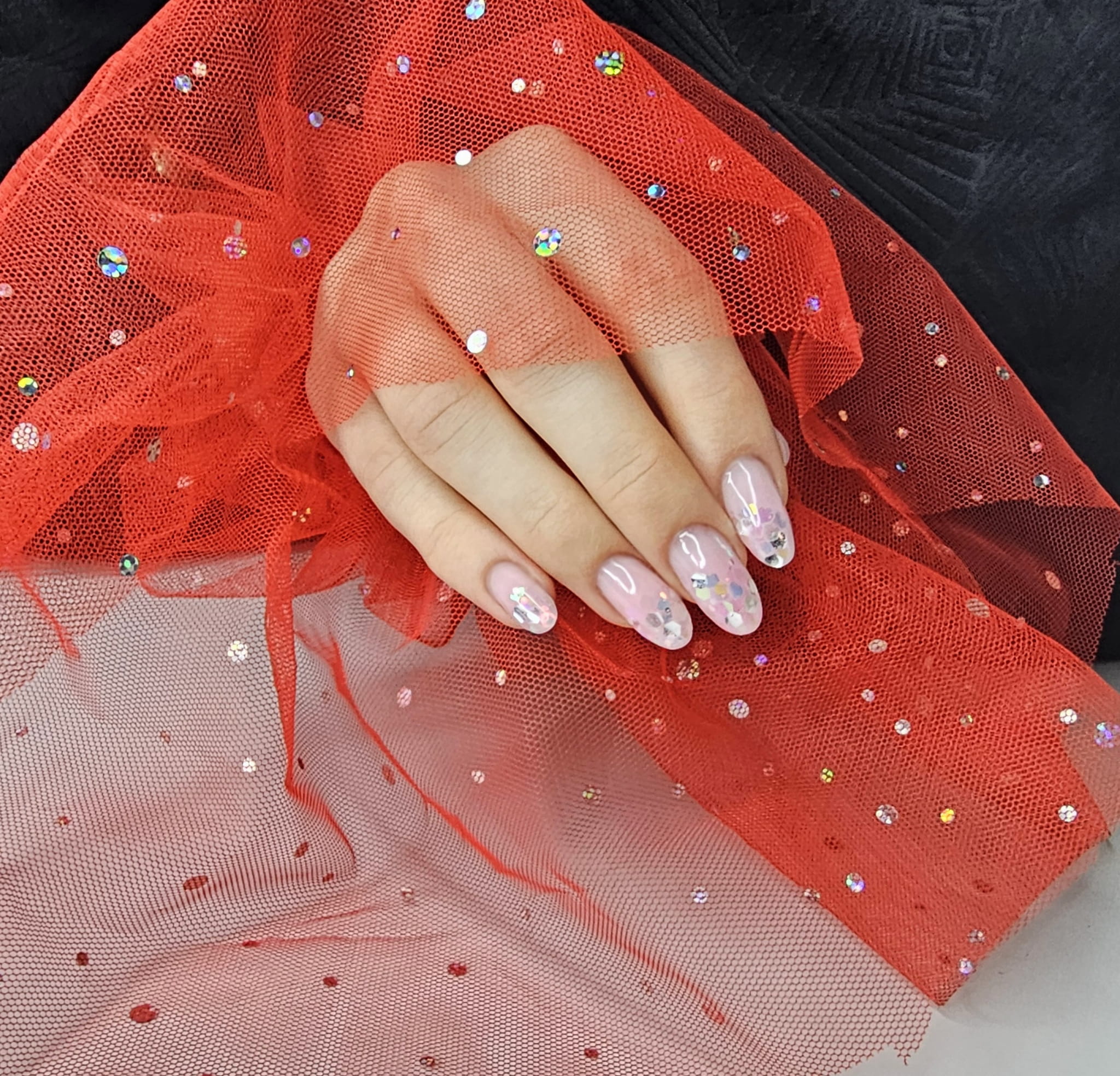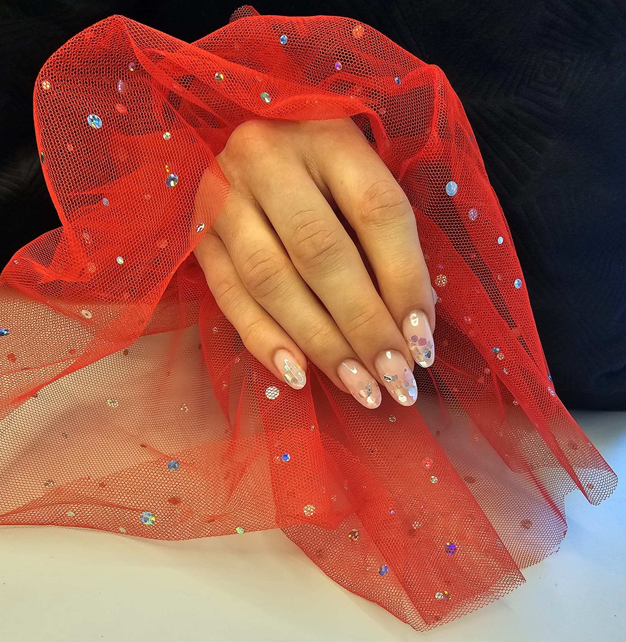 Rękaw do zdjęć paznokci tiul czerwony kropki holo