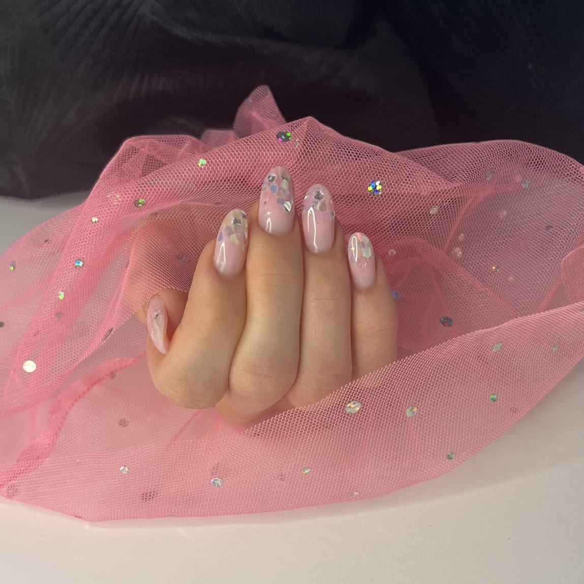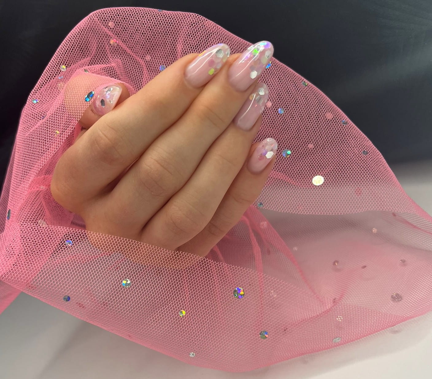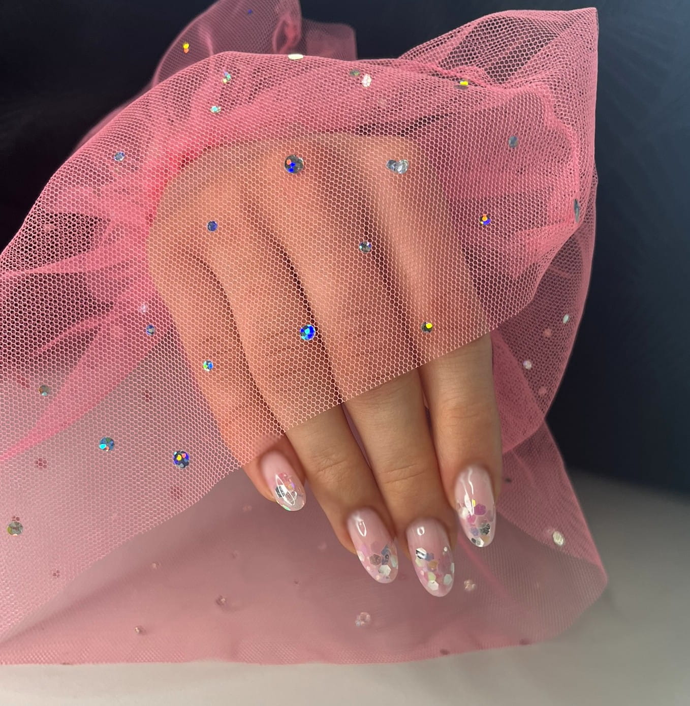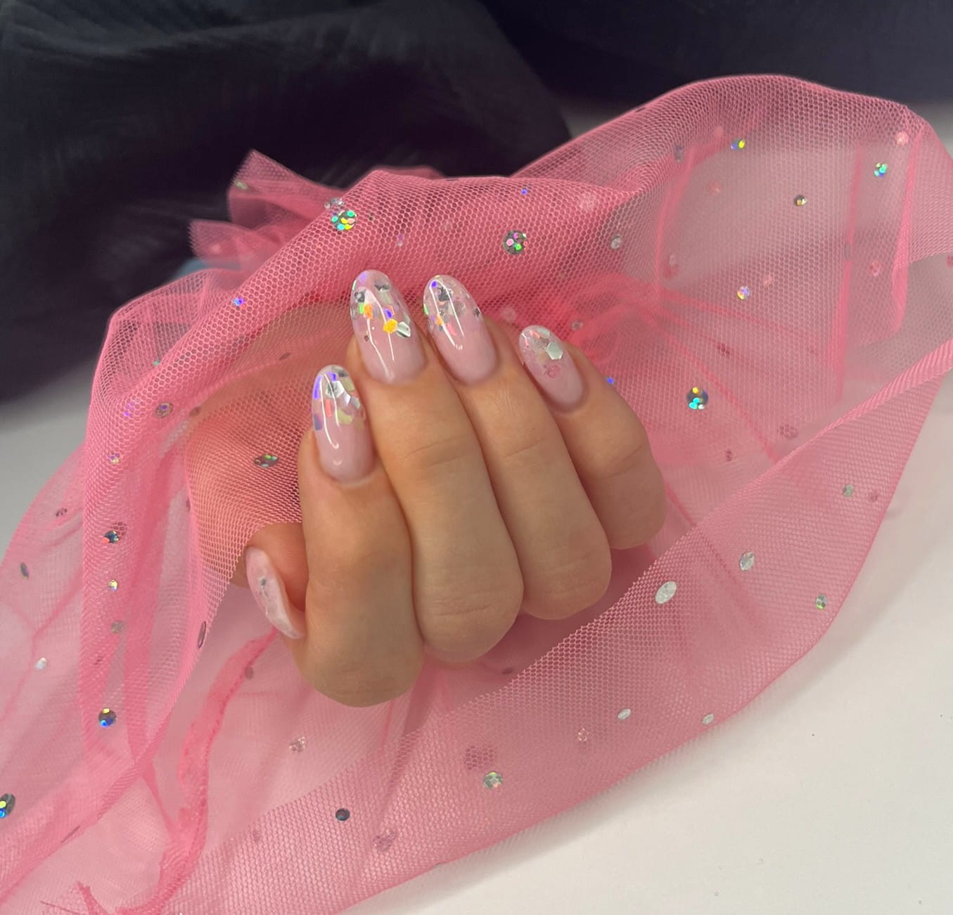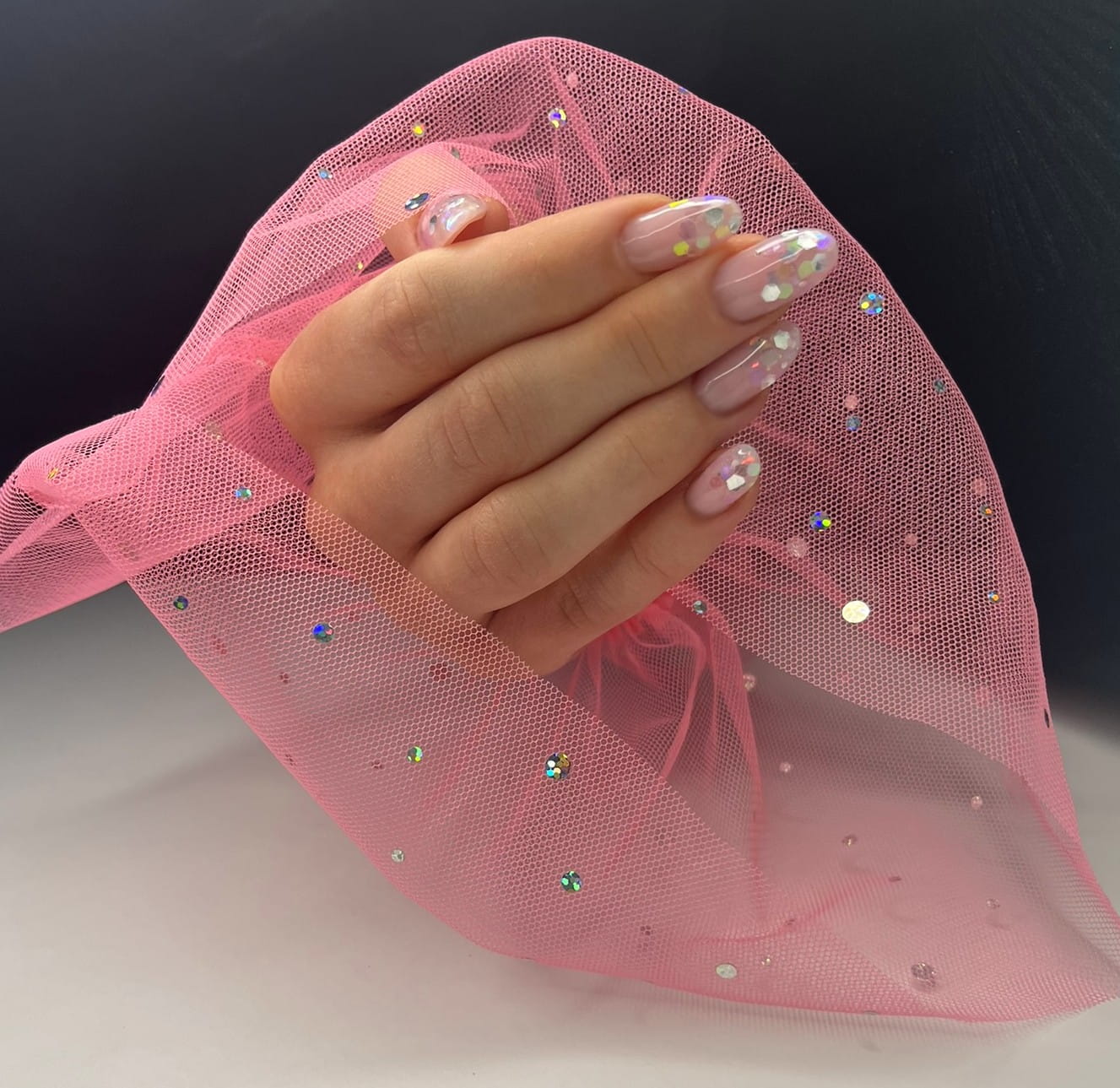 Rękaw do zdjęć paznokci tiul różowy kropki holo
